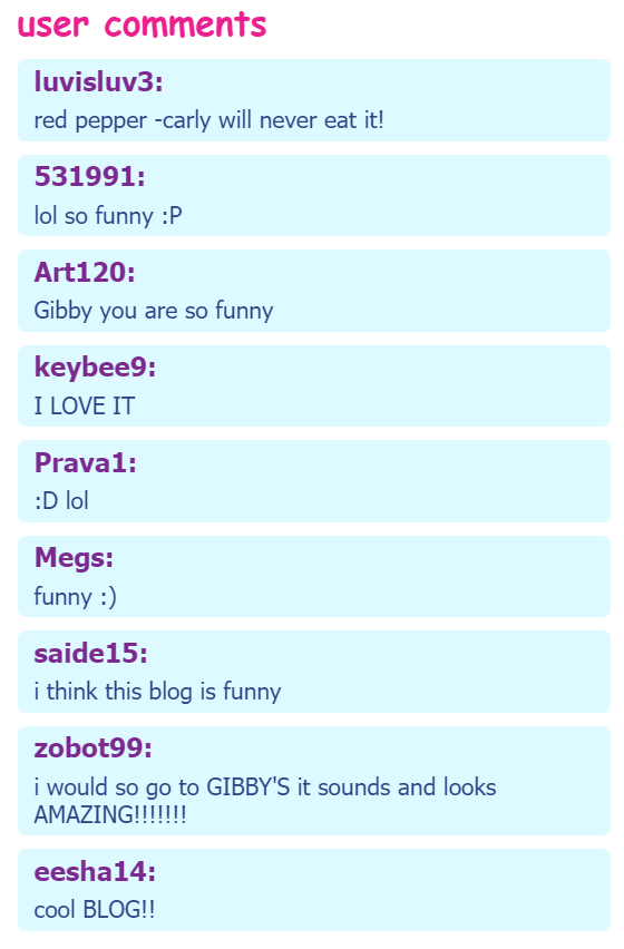 Gibby's Restaurant Reviews is an iCarly.com blog written by Carly Shay about Gibby's restaurant reviews.