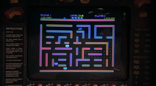The game's scoring system is similar to Pac-Man, with some differences: Like Pac-Man, the first cat the player attacks in the game is worth 200 points, the second cat is worth 400 points, the third cat is worth 800 points, and the fourth and final cat is worth 1600 points. The small cheese pieces are worth 10 points, and the large cheese-wheel are worth 50 points. The point values of the bonus prizes (cheesecake) are similar, but not identical to the bonus prizes in Pac-Man. In the first stage, the cheesecake bonus prizes are worth 100 points, 200 points on the second stage, 500 points on the third stage, 700 points on the fourth stage, and 1,000 points on the fifth stage. But the 1-up or extra life point value is where the similarities end, because in Pac-Man the player gets an extra life every 10,000 points, but in Pak-Rat the player gets an extra life every 100,000 points. Pak-Rat also appears to add a multiplier during upper stages, when Spencer reached level 23 on Pak-Rat the large cheese-wheels are worth 250 points. In Pak-Rat the pen where the cats rejuvenate themselves after being attacked by the player is called a litter box by the game's instructions, where the pen in Pac-Man is called the ghost pen.