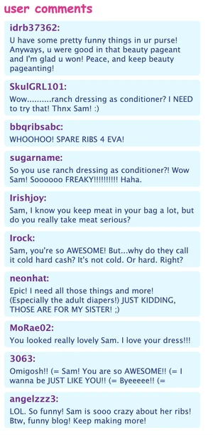 What's In My Pageant Bag? is an iCarly.com blog written by Sam Puckett about the essentials she keeps in her bag while competing in pageants.